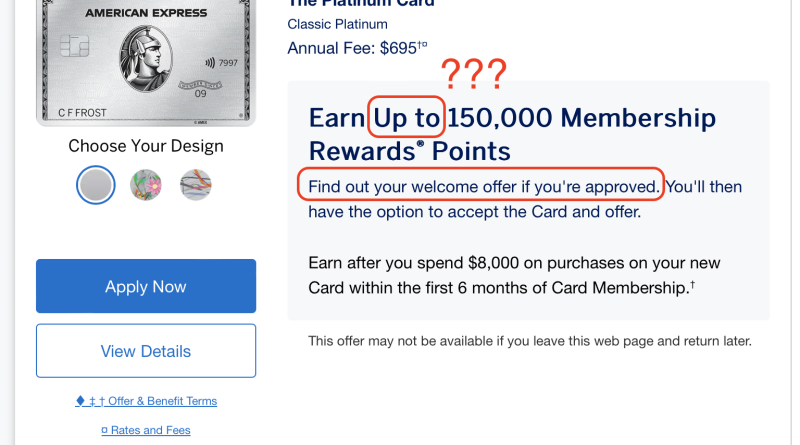 Since we updated the new link for the 150k welcome bonus for the AmEx Platinum a few days ago, many attentive readers have discovered that the terms of this 150k offer are written as ‘Up to 150,000’, followed by ‘Find out your welcome offer if you’re approved.’ This means that you only find out how much of a welcome bonus you will receive after you apply and are approved by AmEx! This is quite disgusting.